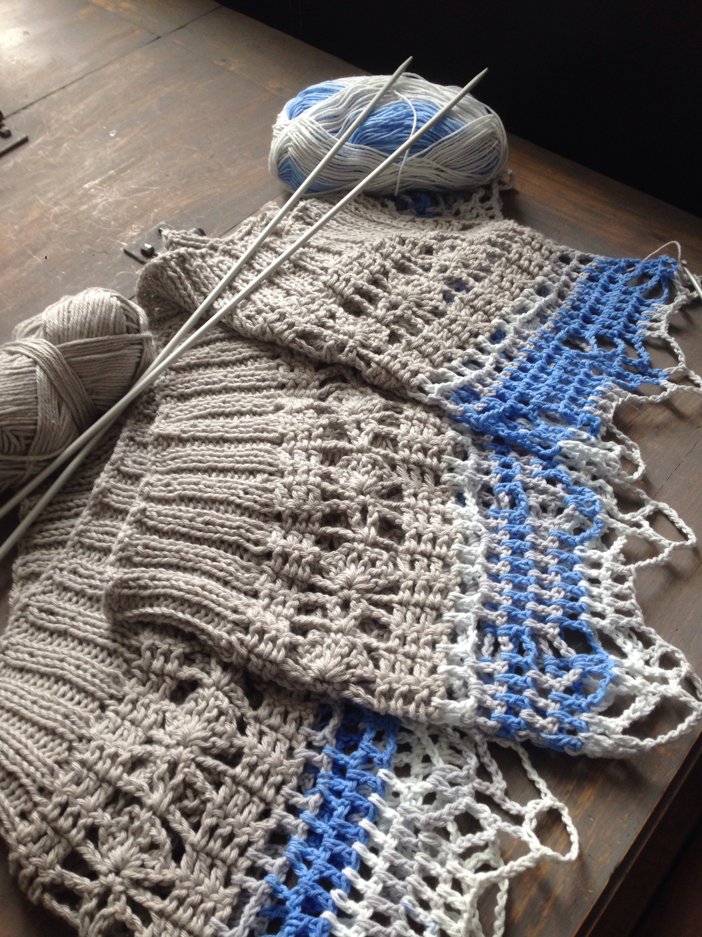 Ik ben meer van het haken, breien vind ik eigenlijk meer bij de winter horen.. Toch ben ik aan de slag gegaan en heb ik breien en haken gecombineerd in een zomerse sjaal, gemaakt van katoengaren. 2 verschillende, een lichtgrijs garen en een garen met een kleurverloop… Van hemelsblauw naar wit en dan weer naar grijs. Mooi!