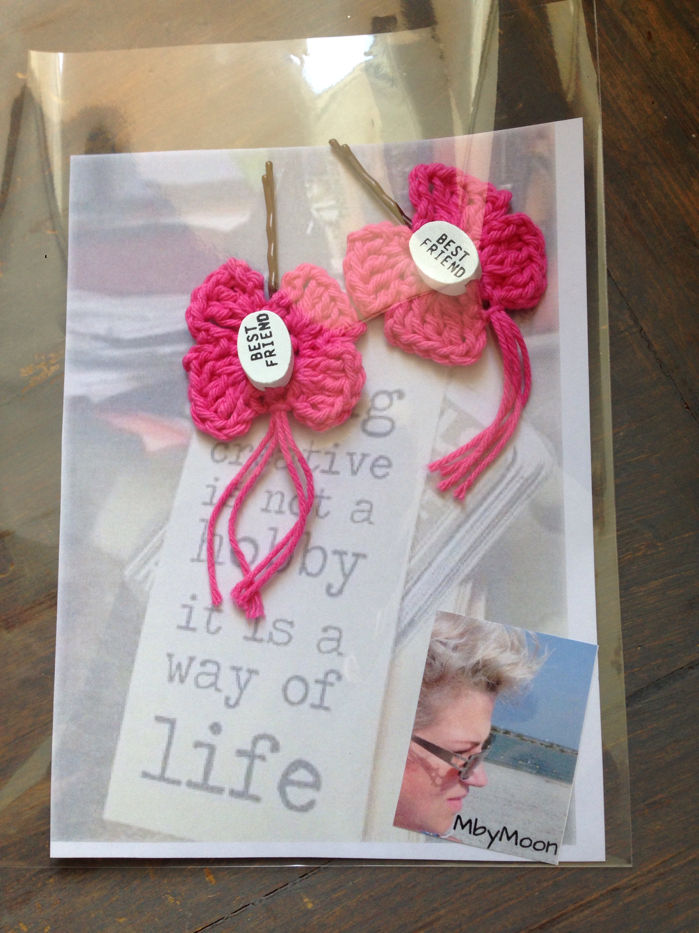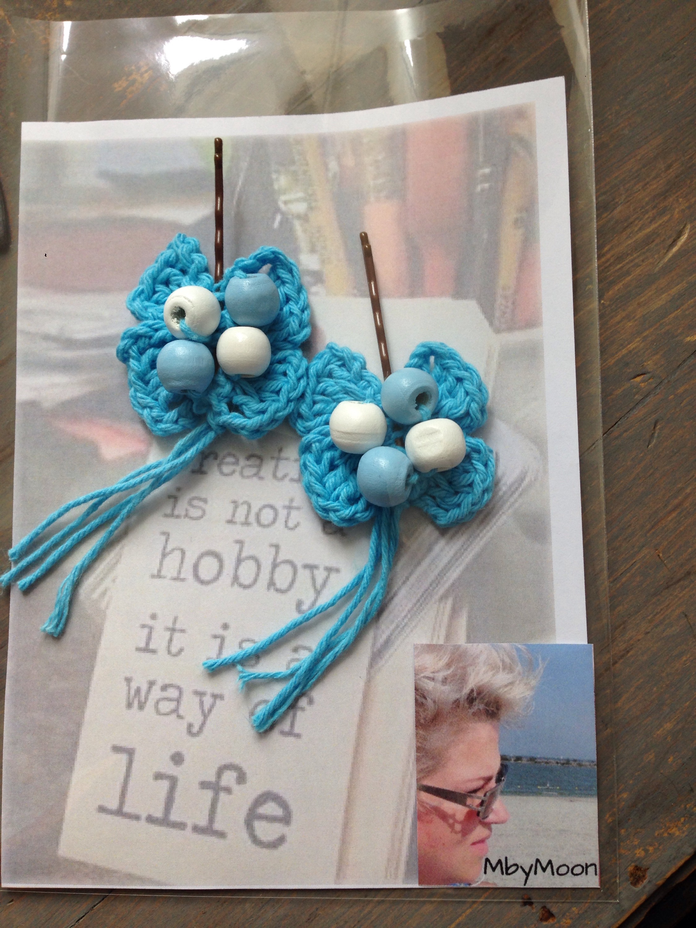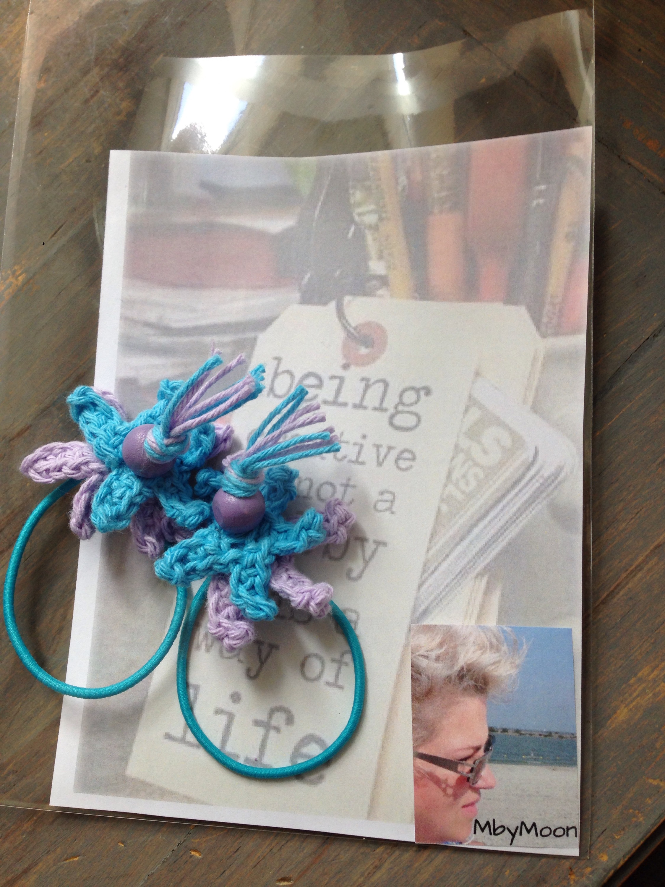 Ik ben meteen aan de slag gegaan, moet ik eerst iets verzinnen… gezien het onderwerp van haar site, zouden gehaakte haarspeldjes of elastiekjes voor jonge meiden het leukste zijn. Ik heb 4 setjes gemaakt. Leuke achtergrondafbeelding uitgeprint, nog een fotootje met ook mijn blog-naam erbij, alles mooi in een geschenkzakje en ze zijn al klaar om gewonnen te worden!