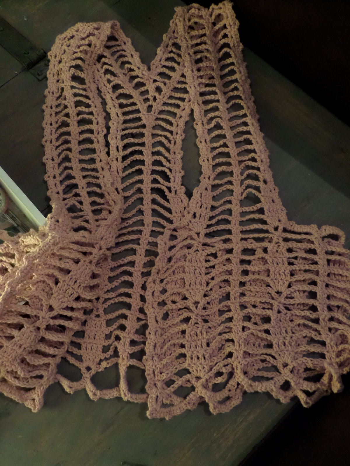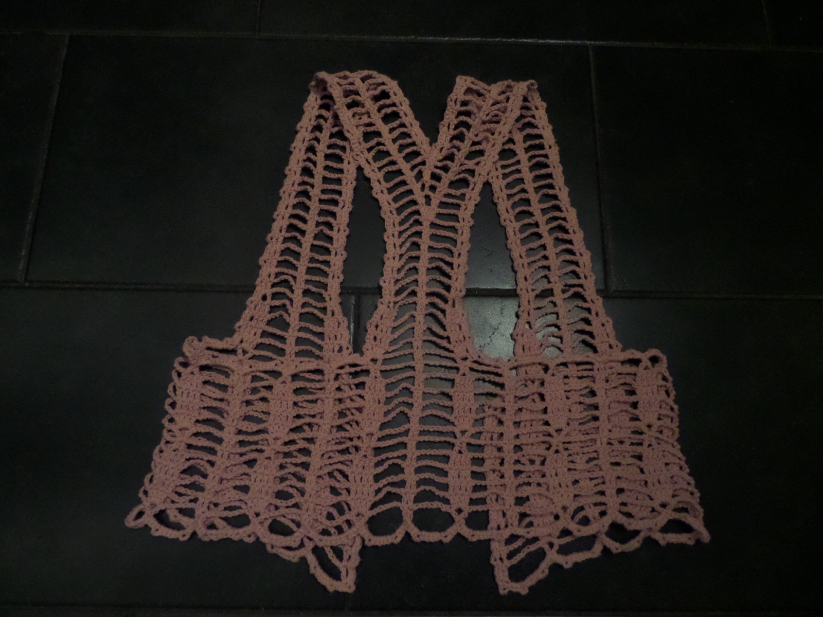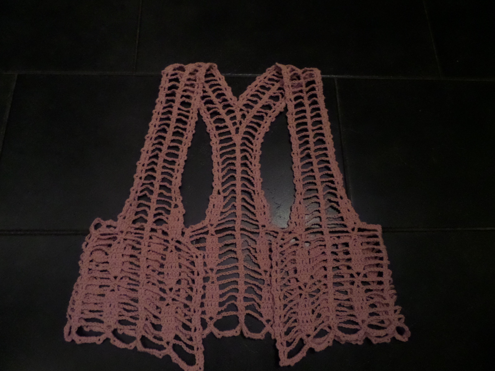 Maar helaas had ik de maten niet goed, kon ik het weer uithalen. Nadat ik weer hetzelfde (niet leuke, want het haakt ontzettend traag!) haakpatroon gebruikte, gaf mijn dochter aan dat ze het eigenlijk liever iets anders wilde. Zij het internet afzoeken, komt ze met een voorbeeldfoto en kon ik weer aan de slag… helaas, ik had 3 bolletjes van dit garen van 50 gram kunnen scoren in de uitverkoop en ik had niet genoeg garen voor haar laatste idee. Dus wéér uithalen….. daarom knoop doorgehakt, het wordt een giletje voor mijzelf.