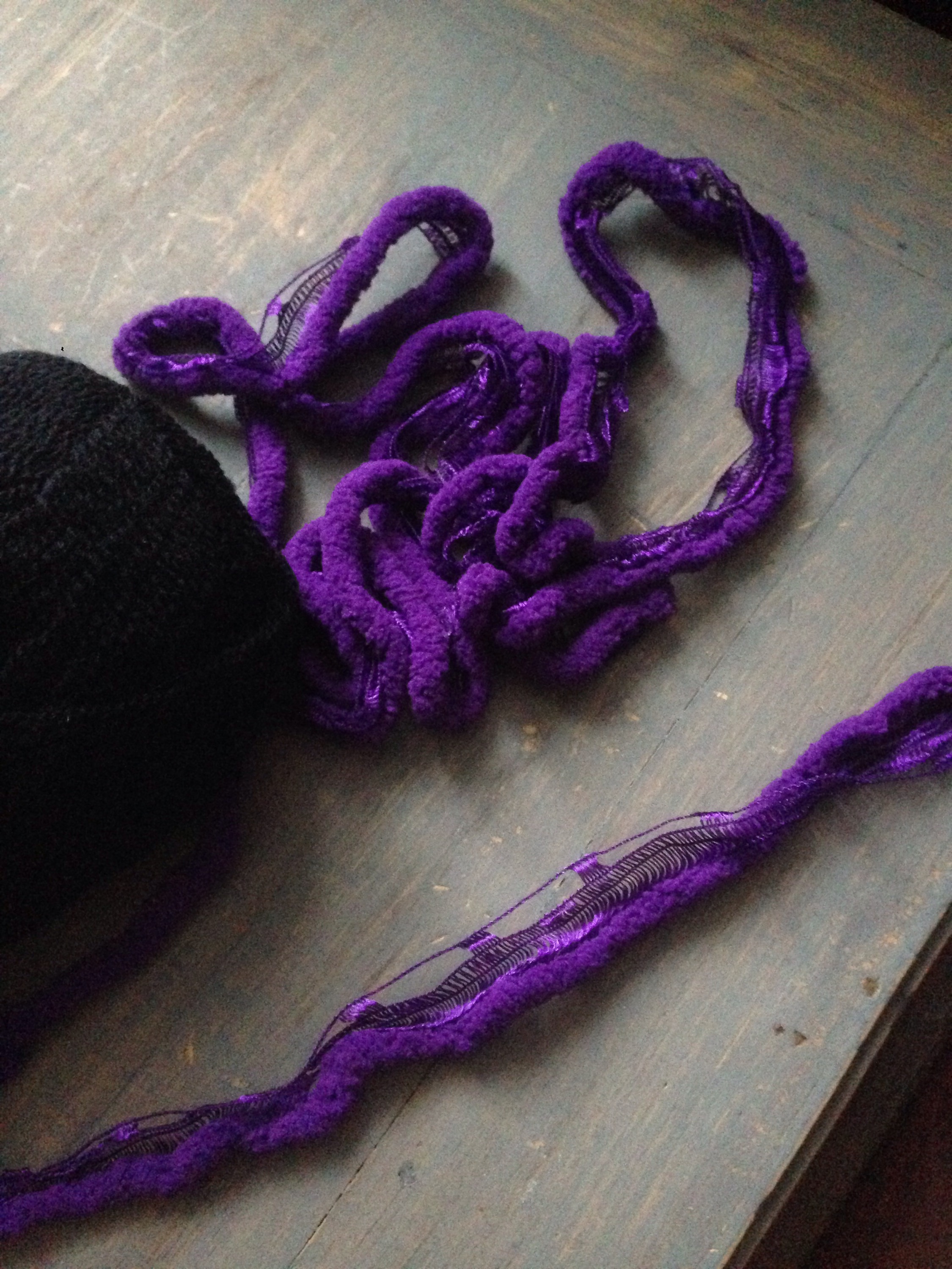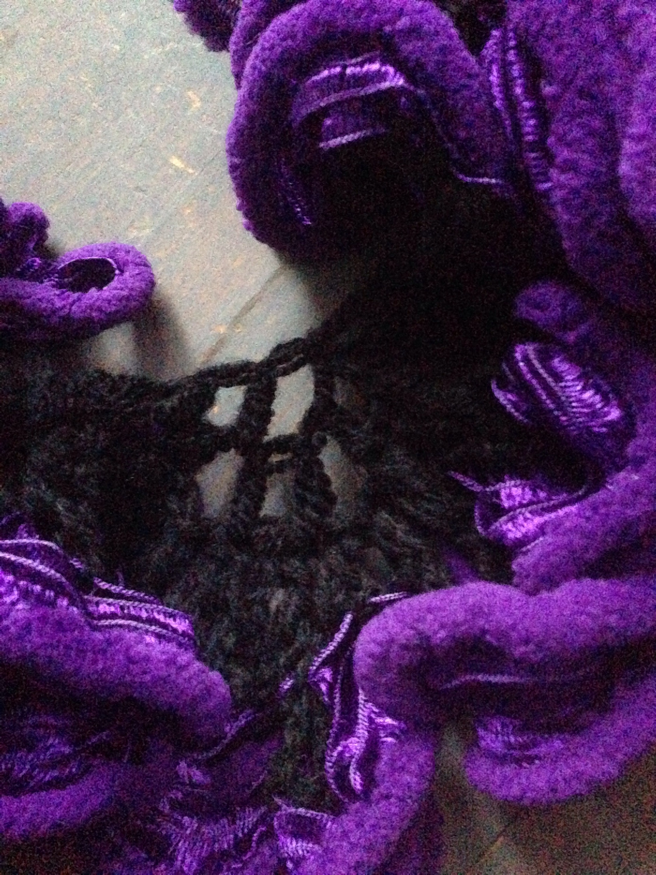 Ik ben begonnen met 2 draden fluffy paars naast elkaar, met zwart garen en lossen en vasten heb ik deze aan elkaar gehaakt.