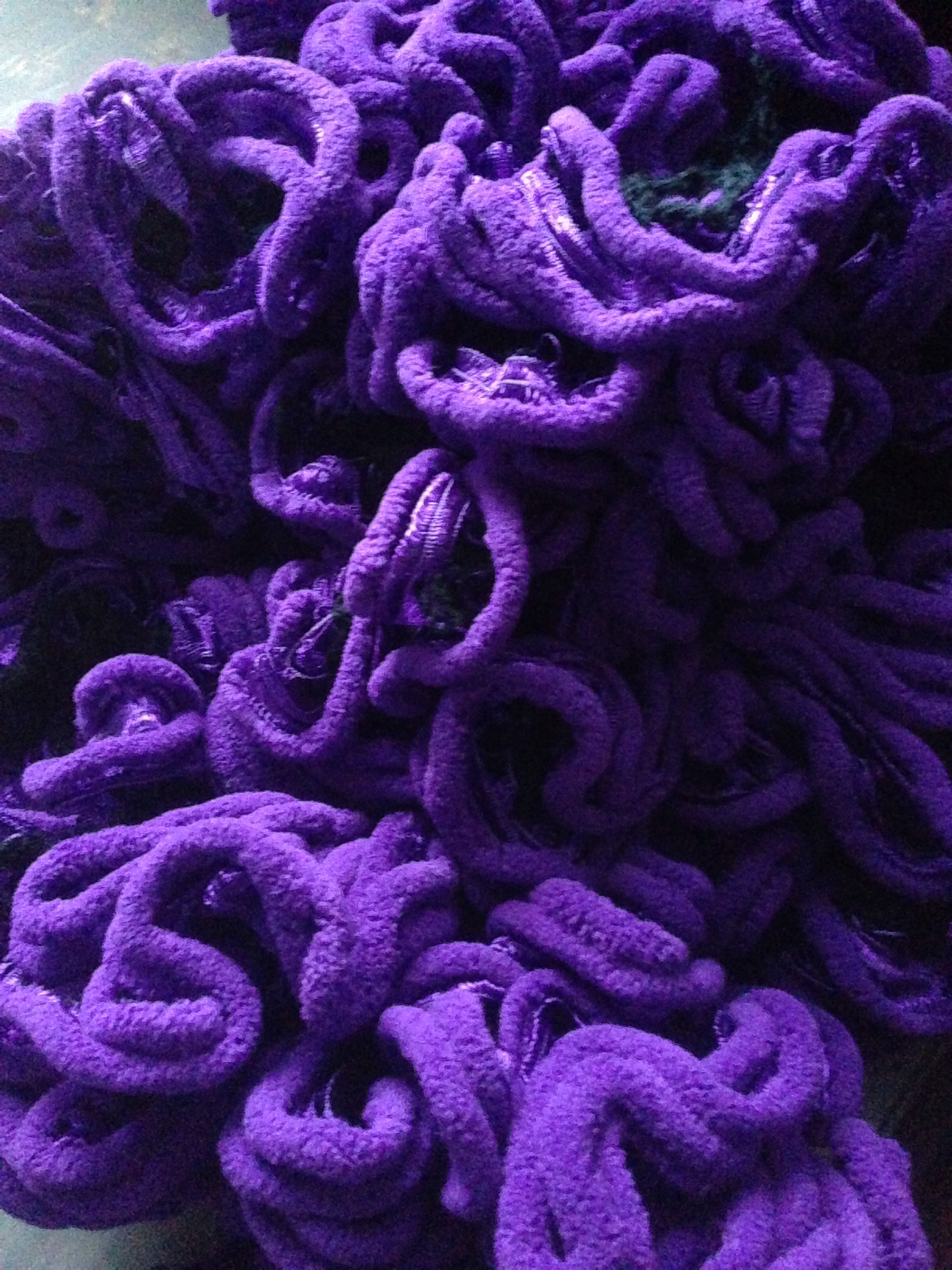 Je begint met het zwarte garen in het 1e boogje paars vast te knopen, je haakt telkens 1 vaste in 2 boogjes (want 2 draden) paars, dan 3 lossen en weer 1 vaste in het volgende boogje van 2 draden paars. Nadat ik zo de 2 paarse fluffy draden volledig aan elkaar gehaakt had, heb ik mijn werk (die je gewoon weer als bol kunt opdraaien, want heeeeeeeel lang) omgedraaid. 3 lossen (hoogte van 1 stokje) en meteen 1 stokje in het 1e boogje van 3 lossen zwarte draad uit de vorige toer. Vervolgens sla je 1 à 2 boogjes over en haak je weer een stokje. Géén lossen tussendoor, dus gewoon alleen maar stokjes. Einde van de toer, weer het werk draaien, 3 lossen (wederom hoogte van 1 stokje) en meteen 1 stokje haken tussen 2 stokjes van de vorige toer. Daarna haak je telkens weer stokjes in de openingen van de stokjes uit voorgaande toer, maar je slaat telkens weer 1 à 2 openingen over. Daarmee maak je de de sjaal steeds korter en krijg je een soort kronkeleffect, maar dat maakt de sjaal alleen maar leuker. Het luistert niet zo nauw hoeveel en hoevaak je boogjes/openingen overslaat, gewoon op gevoel, haakt heel relaxed.