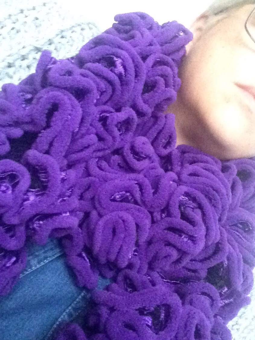 Met het opruimen/uitzoeken van mijn voorraad garens, kwam ik 2 bollen fluffy paars garen tegen, ooit eens (samen met dezelfde garens in petrol-kleur) gekocht bij de Action. Van de petrol-kleurige had ik een hele tijd geleden al een sjaal gemaakt, die ik aan mijn beste vriendin heb gegeven, want zij was op slag verliefd op die sjaal.