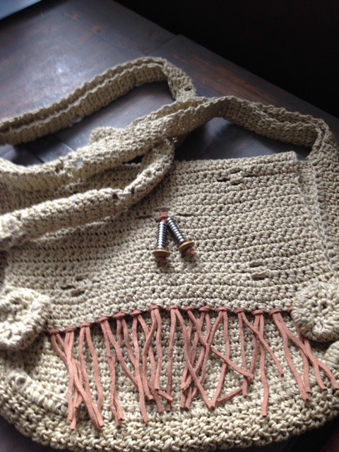 Dit tasje heb ik zo ongeveer 20 jaar geleden (zonder patroon) gehaakt van bindtouw, ik herinner me nog wel dat ik daar erg pijnlijke vingers van kreeg en dat het haken met dit stroeve touw vermoeiend langzaam ging.