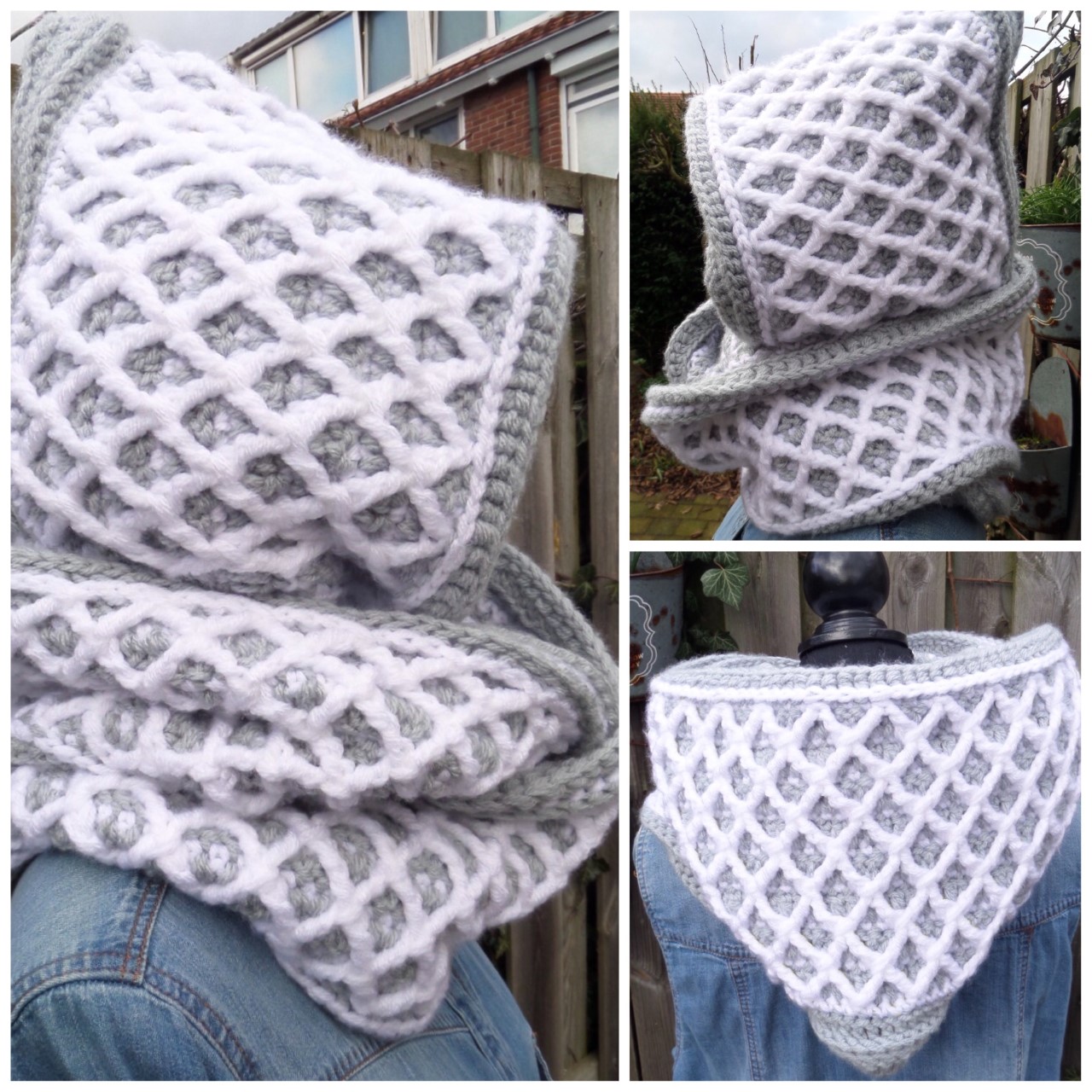 (VERKOCHT!) 100% acryl, met de Diamant Trellish stitch gehaakt in grijs/wit, een variatie op mijn hoodycolsjaal Hoody. Ter info: het haakpatroon van hoodycolsjaal Hoody is gratis te downloaden via https://mbymoon.com/gratis-patronen