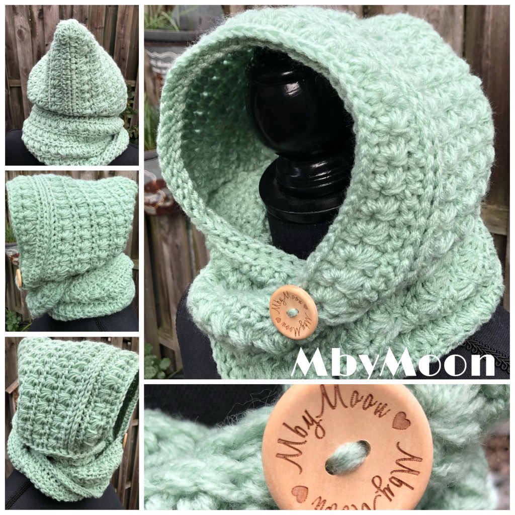 Zachtgroen van 100% acryl. Veilig voor kinderen, omdat er geen loshangende sjaal is die achter speeltoestellen blijft hangen of in de spaken van een fiets draait. Met de hoody omlaag extra warm in de nek. Kun je niet via PayPal betalen, stuur me dan een mail via mbymoon@outlook.com. Ik heb ook andere betaalmogelijkheden (via bankoverschrijving of een betaalverzoek/Tikkie)